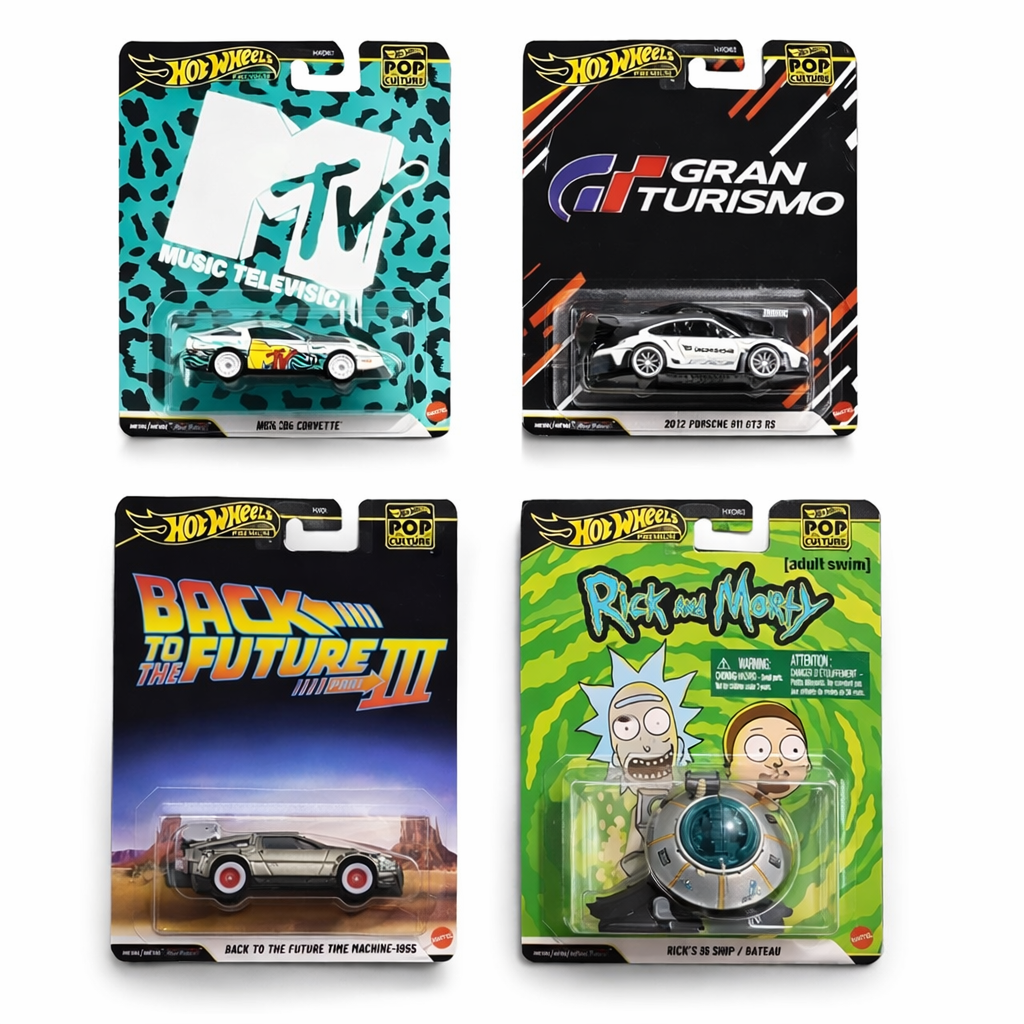 Conjunto especial da linha Hot Wheels Premium Pop Culture, trazendo miniaturas altamente detalhadas inspiradas em ícones da cultura pop. Modelos com acabamento premium, pneus de borracha Real Riders e construção Metal/Metal, ideais para colecionadores.